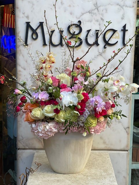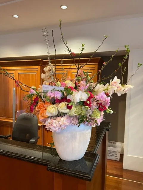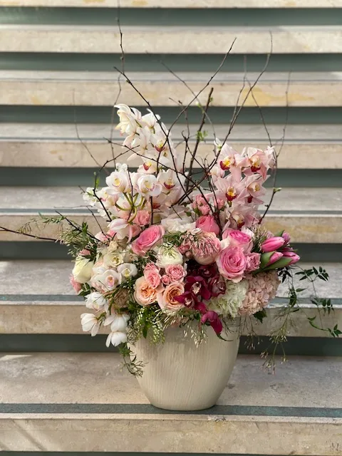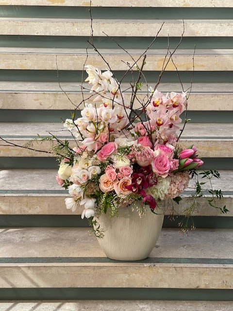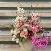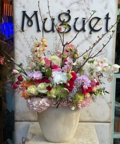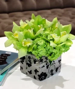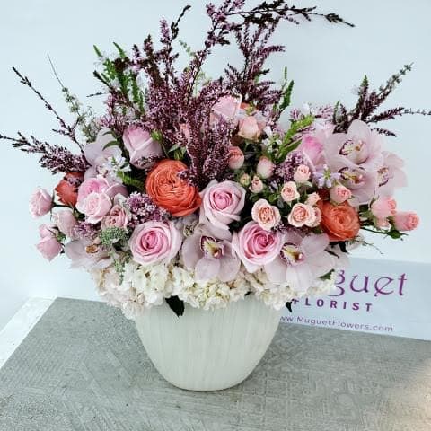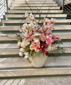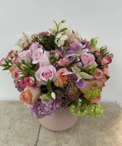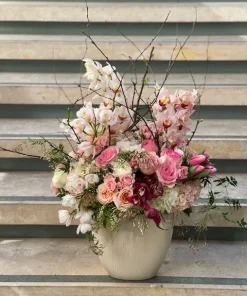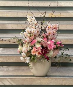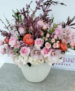 Embark on a journey through the world of refined romance with the “Elegant Romance Symphony” – an arrangement that harmoniously melds the exquisite beauty of Cymbidium orchids, roses, garden roses, hellebore, freesia, lilac, and spray roses. This masterpiece of floral artistry captures the essence of love and elegance, blending diverse blooms to create a breathtaking symphony of romantic charm.