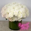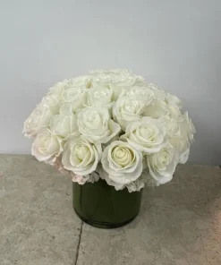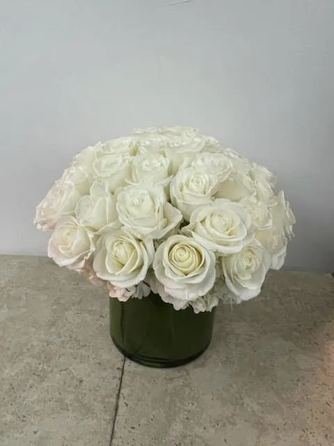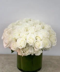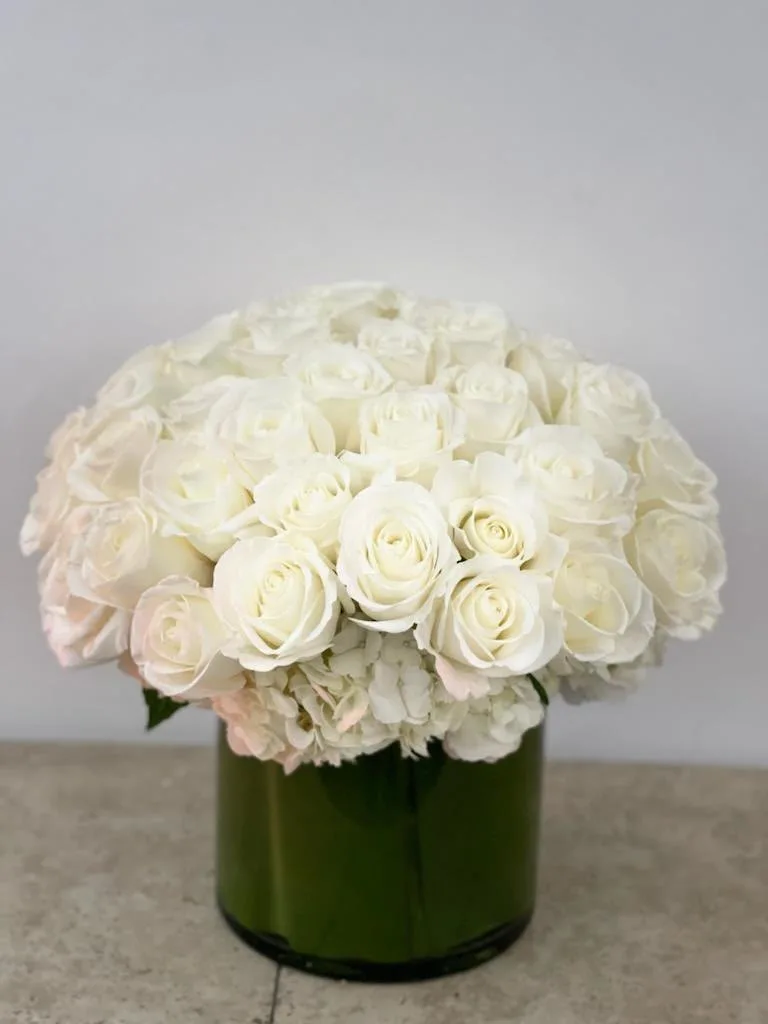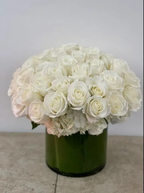 Joy Of Roses Arrangement. Pure joy! Indulge them in a garden of fresh-cut roses 50 wondrous white roses take center stage in this chic bouquet, with stylish white hydrangeas in a glass vase.